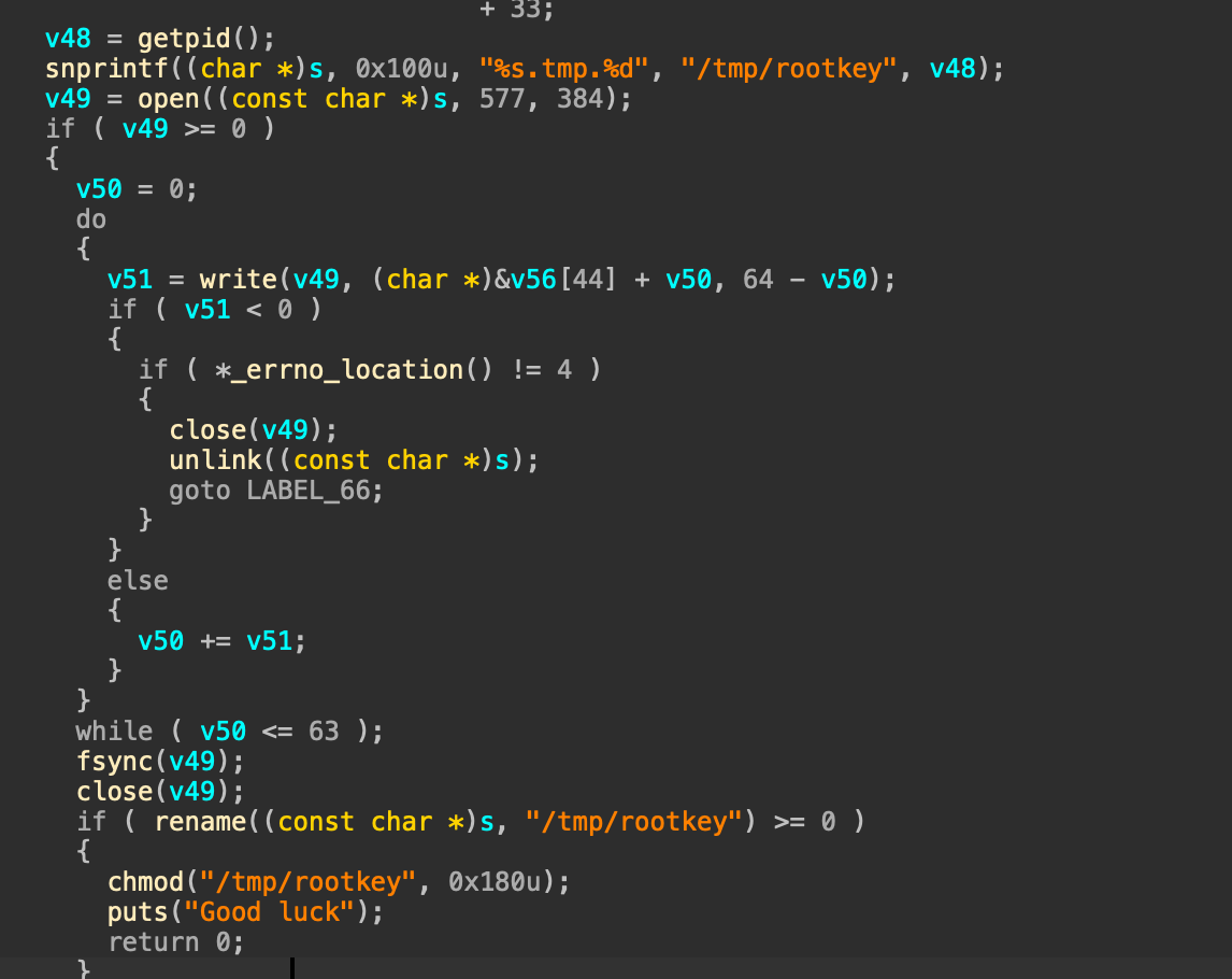 分析这个binary可以发现,这里会创建一个64b大小的文件,然后再重命名为/tmp/rootkey,最后输出Good luck