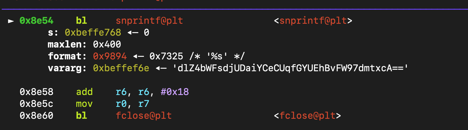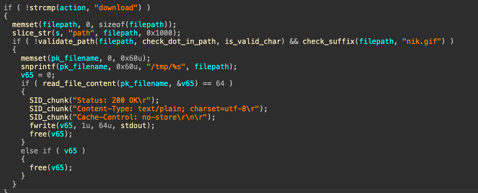 当action为download的时候,可以设置path字段,然后下面存在一个snprintf函数,这里其实存在一个截断的问题,同时注意check_suffix(filepath, “nik.gif”)会检查文件的后缀是不是nik.gif,那么其实可以尝试去构造一个路径,类似于/tmp/./././xxxxxrootkeynik.gif的形式,这样保证0x60截断了nik.gif,同时绕过后缀的检查,然后同时还可以访问到/tmp/rootkey文件,接着下面读取文件内容,同时满足文件大小是64b,然后会将内容输出