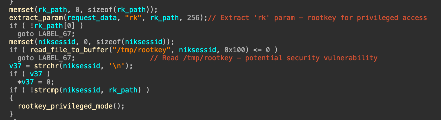 这里人为传入的rk参数如果与/tmp/rootkey的内容一致,则会进入下方的函数逻辑,继续跟进