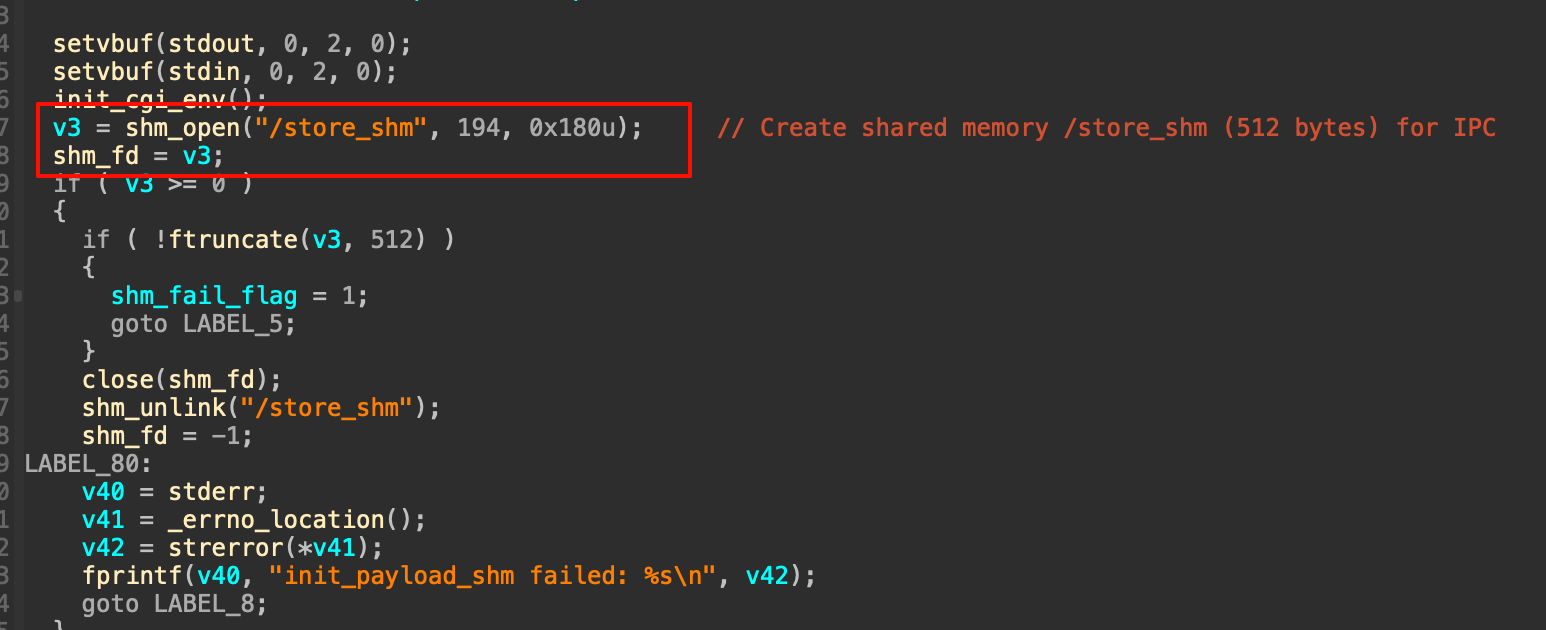 这里我从manage.cgi开始分析,可以发现一些值得关注的地方,比如说这里创建了一个共享内存,接着会用一个bss段上的指针去指向这个共享内存