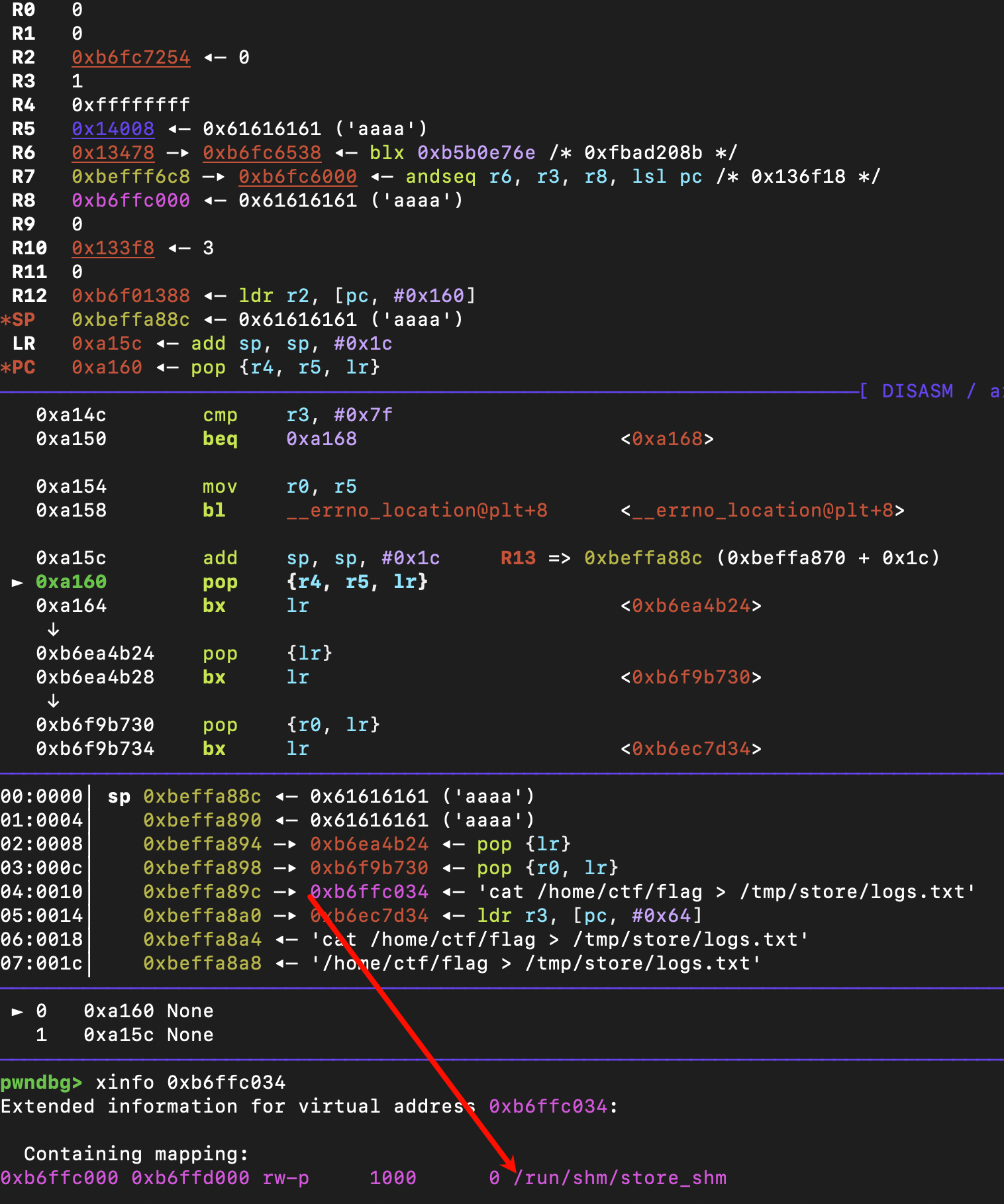 命令执行 由于这题没有pie和aslr,所以可以直接获取到gadget,同时处于稳定性考虑,我们可以直接把system需要执行的字符串写到共享内存上,这样更稳定,然后作为system的参数,这样就可以稳定的rce了