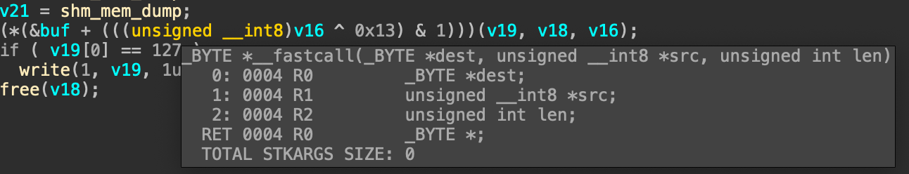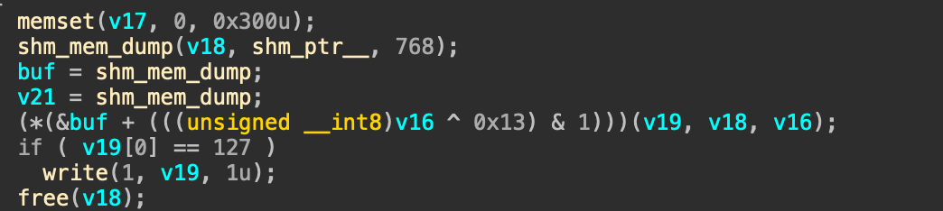 接着这里的(*(&buf + (((unsigned __int8)v16 ^ 0x13) & 1)),由于 & 1操作的存在,因此还是会调用到shm_mem_dump函数,但是此时的v16其实int类型,所以这里如果传入一个负数,就会导致一个溢出,由于是拷贝到v19,而v19是一个栈上的值,所以会造成栈溢出