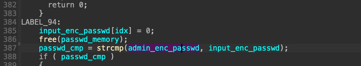 继续分析ida可以发现下方有一段strcmp的逻辑,经过分析可以发现其实是讲我们的输入密码进行加密后与admin加密后的密码进行对比