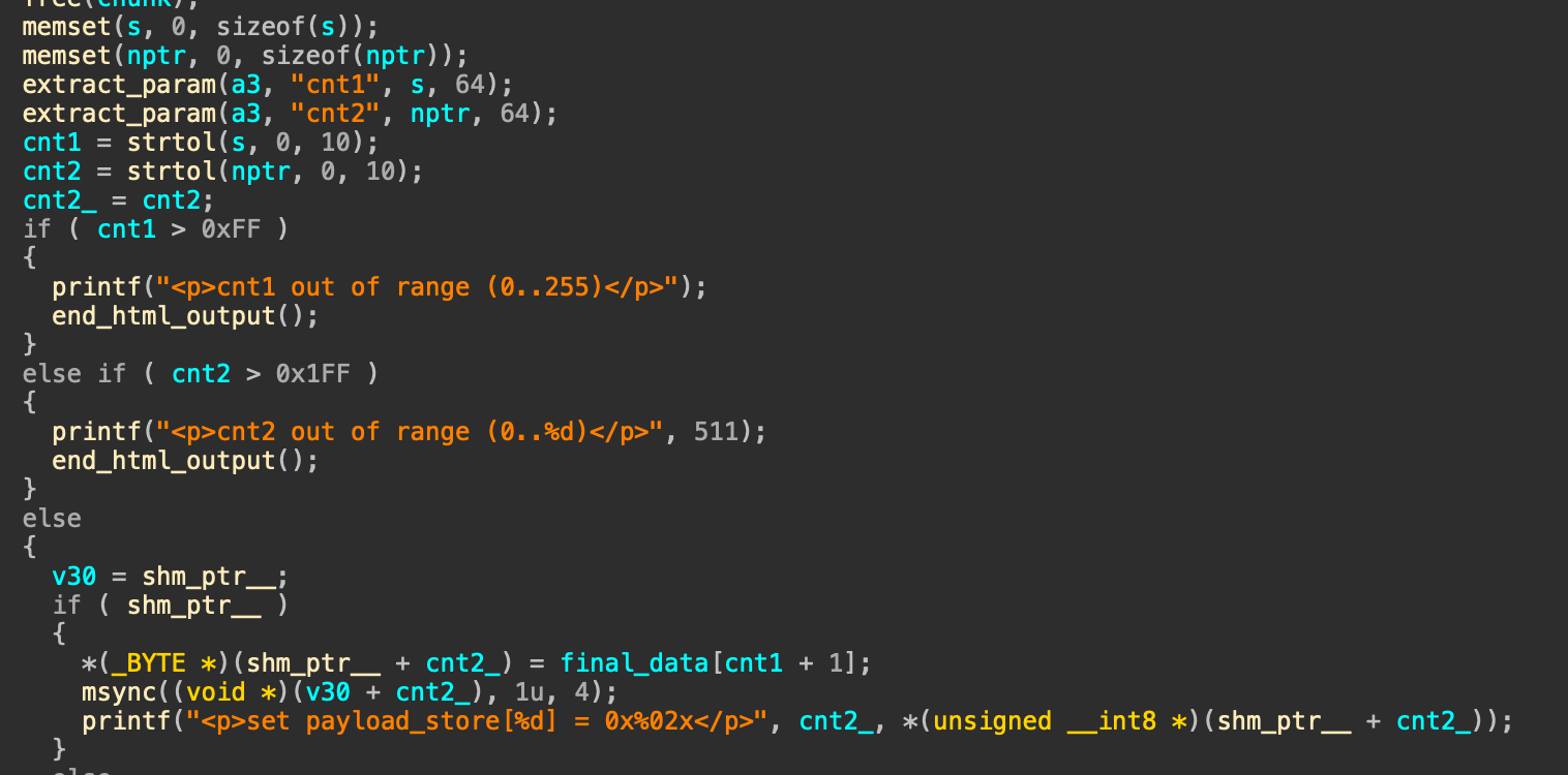 下面就可以通过设置cnt1和cnt2来将我们逃逸的字符写到共享内存上