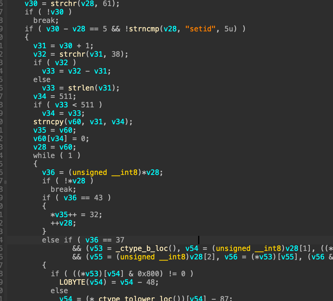 1 2 3 4 5 6 7 8 9 10 11 12 13 14 15 16 17 18 19 20 21 22 23 24 25 26 27 28 29 30 31 32 33 34 35 36 37 38 39 40 41 42 43 44 45 46 47 48 49 50 51 52 53 54 55 56 57 58 59 60 61 62 63 64 65 66 67 68 69 70 71 72 73 74 75 76 77 78 79 80 81 82 83 84 85 86 87 88 89 90 91 92 93 memset (input_enc_passwd, 0 , sizeof (input_enc_passwd)); passwd_len = strlen (passwd); passwd_memory = malloc (passwd_len); if ( !passwd_memory ) goto LABEL_107; if ( passwd_len > 0 ) { do { passwd_memory[idx] = xor_key[idx % 10 ] ^ passwd[idx]; ++idx; } while ( passwd_len != idx ); idx = 0 ; input_enc_passwd_ = input_enc_passwd; idx_ = 0 ; while ( 1 ) { v70 = passwd_memory[idx_]; if ( passwd_len > idx_ + 1 ) { v57 = passwd_memory[idx_ + 1 ]; if ( passwd_len <= idx_ + 2 ) { LOBYTE(v58) = 0 ; v59 = (16 * (v70 & 3 )) | (v57 >> 4 ); idx_ += 2 ; v60 = v70 >> 2 ; v61 = 4 * (v57 & 0xF ); v63 = 0 ; v62 = 0 ; } else { v58 = passwd_memory[idx_ + 2 ]; v59 = (16 * (v70 & 3 )) | (v57 >> 4 ); idx_ += 3 ; v60 = v70 >> 2 ; v61 = 4 * (v57 & 0xF ); v62 = v58 >> 6 ; v63 = 1 ; } v64 = v62 | v61; if ( v63 ) { v65 = v58 & 0x3F ; v66 = 1 ; } else { v66 = 1 ; v65 = 0 ; } } else { v66 = 0 ; v71 = v70 & 3 ; ++idx_; v60 = v70 >> 2 ; v59 = 16 * v71; v64 = 0 ; v63 = 0 ; v65 = 0 ; } if ( idx == '\x03\xFC' ) break ; v67 = aAbcdefghijklmn[v59]; input_enc_passwd[idx] = aAbcdefghijklmn[v60]; input_enc_passwd_[1 ] = v67; if ( v66 ) v68 = aAbcdefghijklmn[v64]; else v68 = 61 ; input_enc_passwd_[2 ] = v68; if ( v63 ) v69 = aAbcdefghijklmn[v65]; else v69 = 61 ; input_enc_passwd_[3 ] = v69; idx += 4 ; input_enc_passwd_ += 4 ; if ( passwd_len <= idx_ ) goto LABEL_94; } free (passwd_memory); LABEL_107: output("Internal error." ); return 0 ; } LABEL_94: input_enc_passwd[idx] = 0 ; free (passwd_memory);