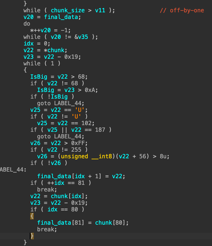 接着的操作比较迷惑,一些奇怪的判断,然后需要注意的是当idx == 80时,会直接执行final_data[81] = chunk[80];然后退出循环,也就意味着chunk[80]不需要经过前面的字符检查,直接被赋值到final_data[81]