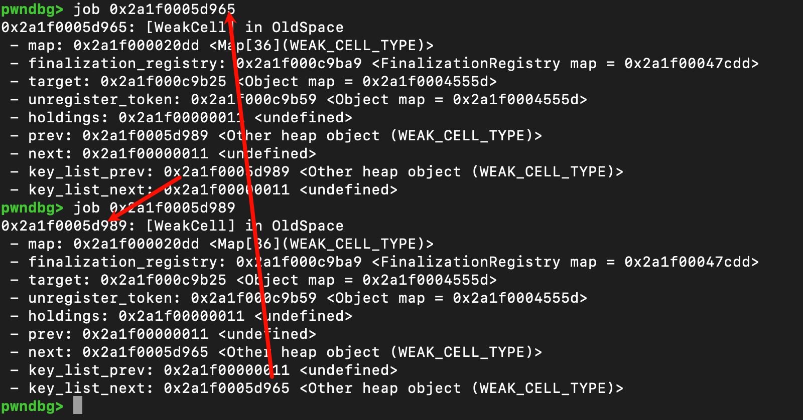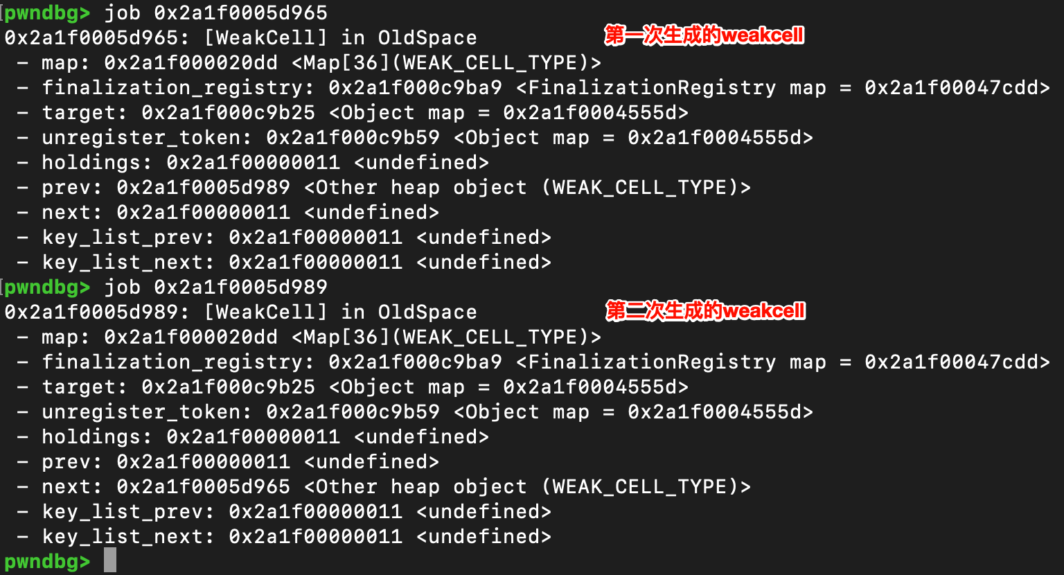 还需要提一嘴的是Weakcell在active_cells中的组织形式是LIFO,从job的输出也可以看出来,新添加的Weakcell对象采用头插法插入到list头部,所以他的prev为undefined,next为旧的Weakcell,同时旧的Weakcell的prev为新的Weakcell,next为undefined