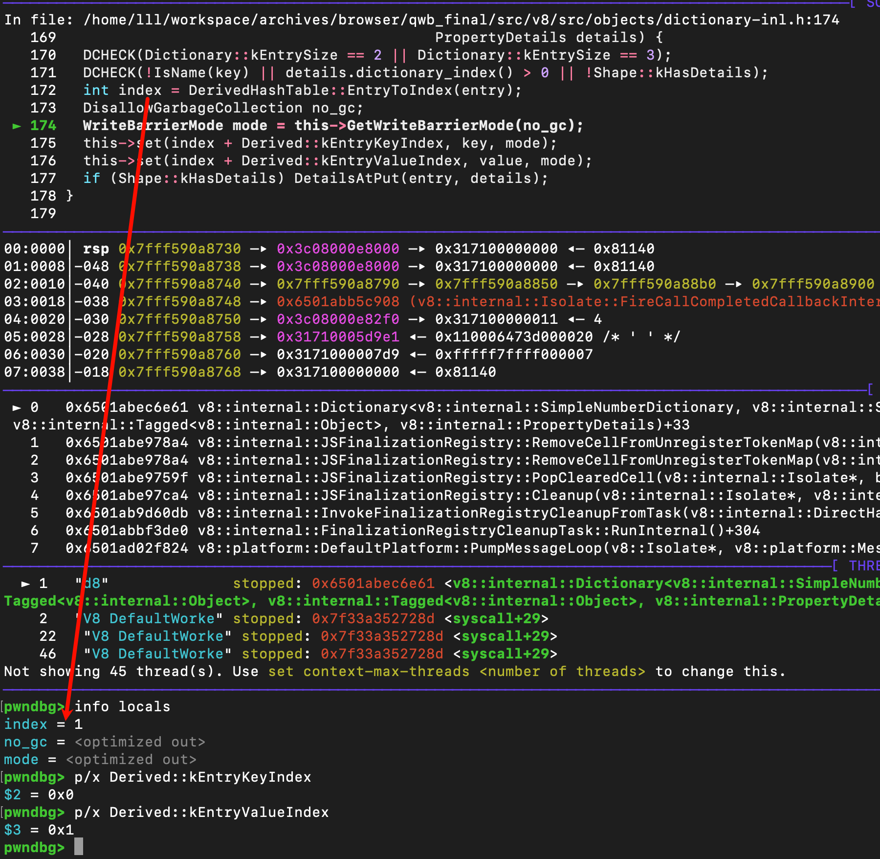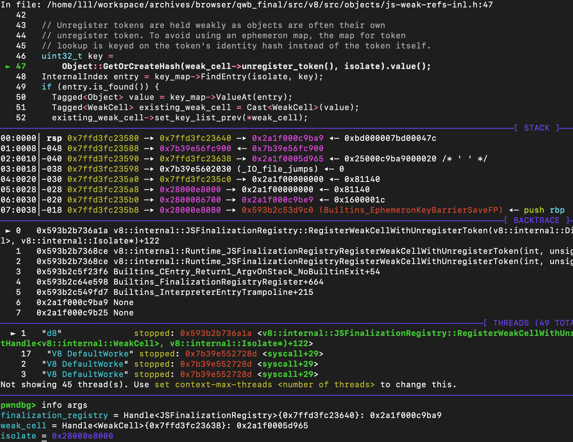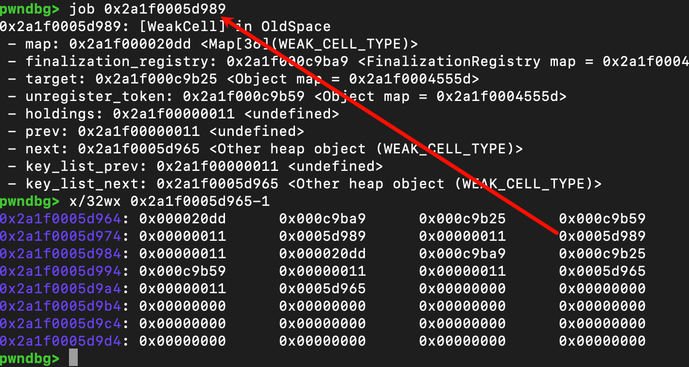 - 使用registry.register进行地址预测,利用 JSFinalizationRegistry::RegisterWeakCellWithUnregisterToken 的逻辑,由于 Hash 命中,V8 会获取我们伪造的“旧 WeakCell”地址,并尝试将其作为链表节点,执行 existing_weak_cell->set_key_list_prev(new_weak_cell)。这实际上向 i + 0x1c 的位置写入了新 WeakCell 的指针。如果这个写入落在 oob_arr 范围内,就能被探测到