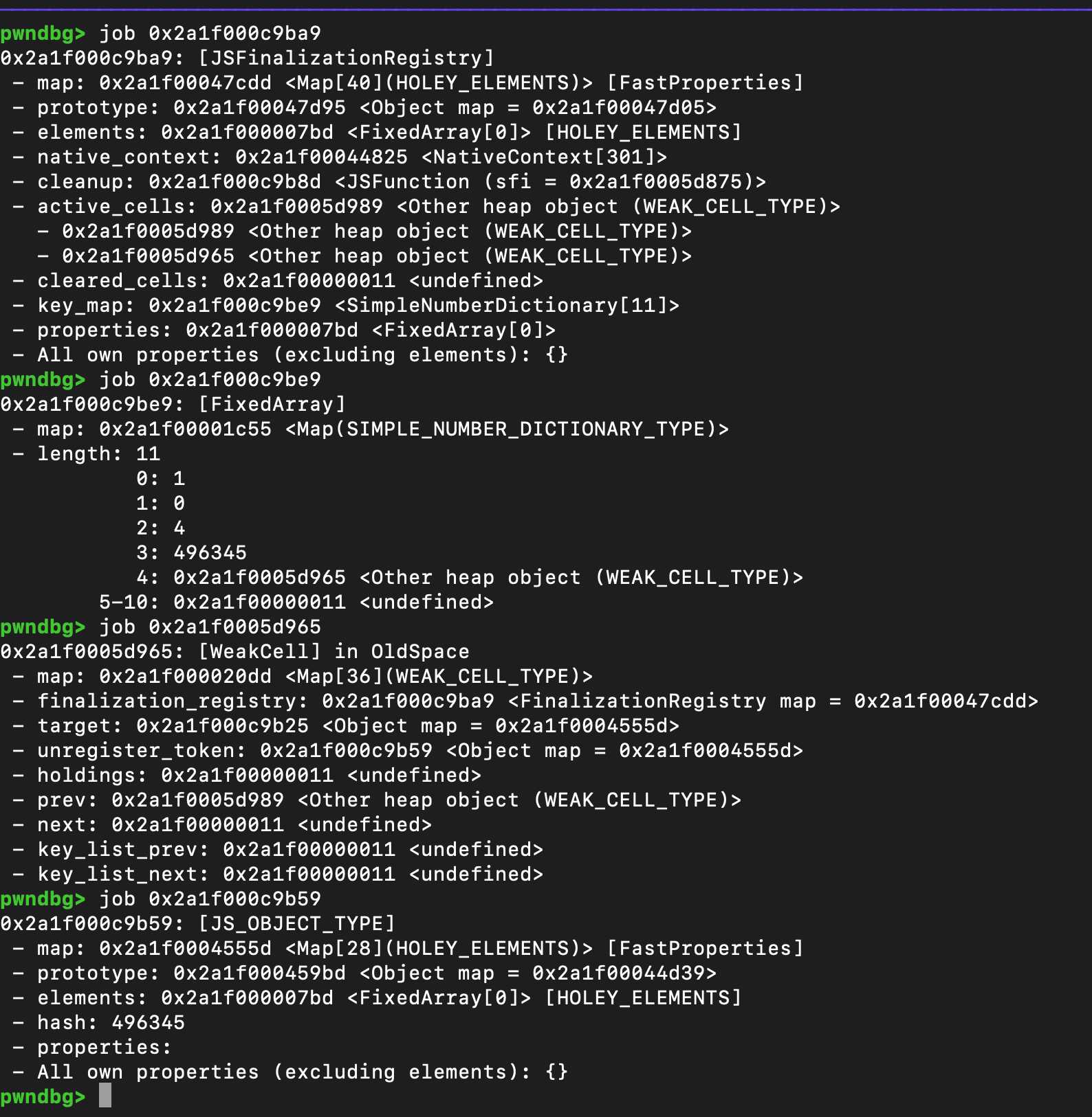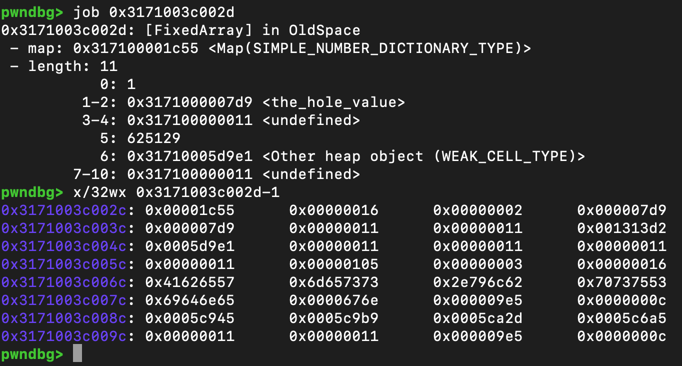 - 由于oob_arr存在0x100项,通过register的方法可以将i+0x1c位置写为一个WeakCell对象的值,如果落在了oob_arr的element里,那么可以通过遍历发现,接着通过i来反推出oob_arr的element地址
