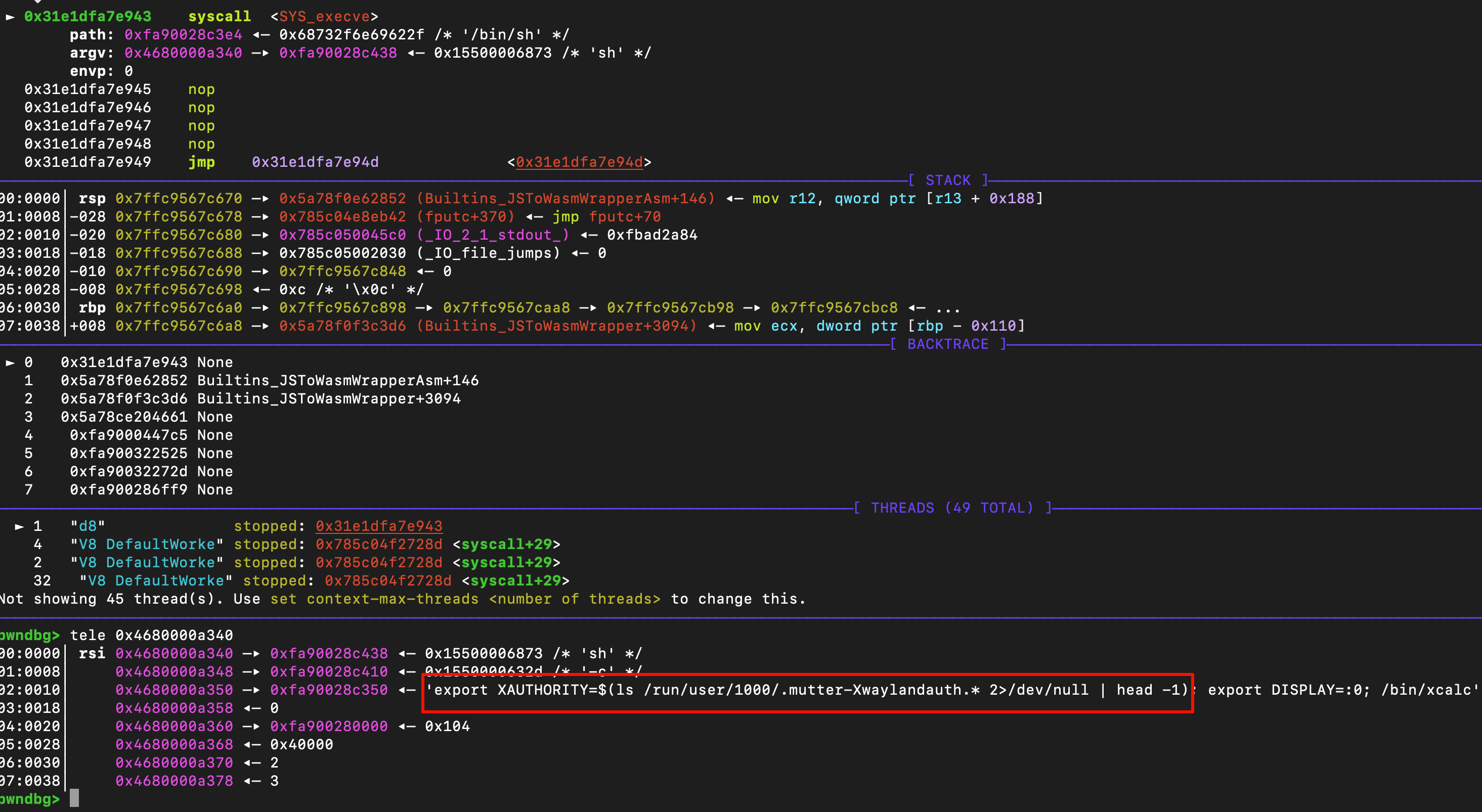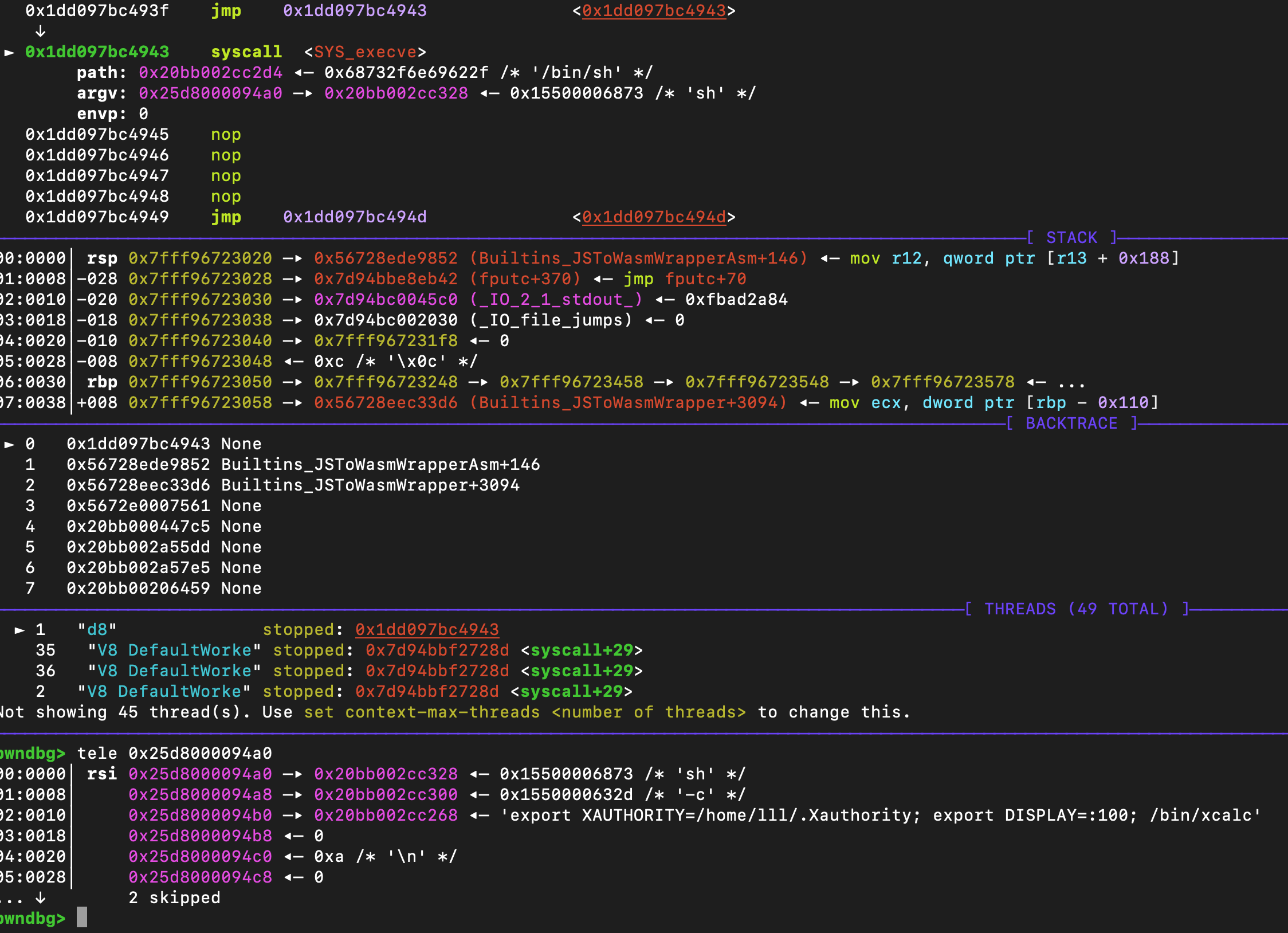 当时现场机器cpu是intel14 gen,在linux平台上有一个pku保护,所以我当时在执行shellcode的时候挂了。解决也很简单,使用jit spray或者wasm函数,我这里为了更加稳定使用了wasm函数。wasm中定义了一些汇编,然后通过传入两个i64的值,来执行execve,然后我每次只需要修改稳定cmd_ptr即可