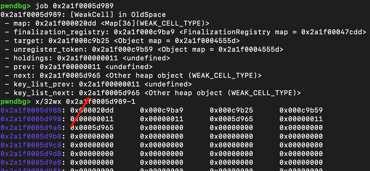 进一步在内存里查看,对于第一次申请的weakcell对象,在偏移0x1c的位置,写上了第二次申请的weakcell对象的地址